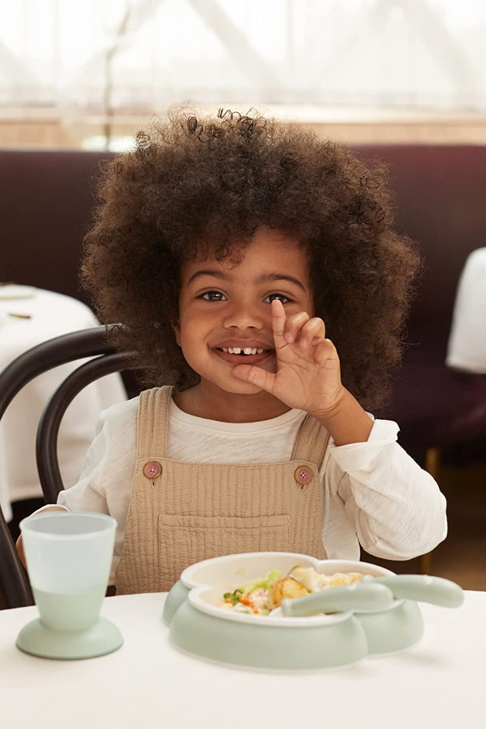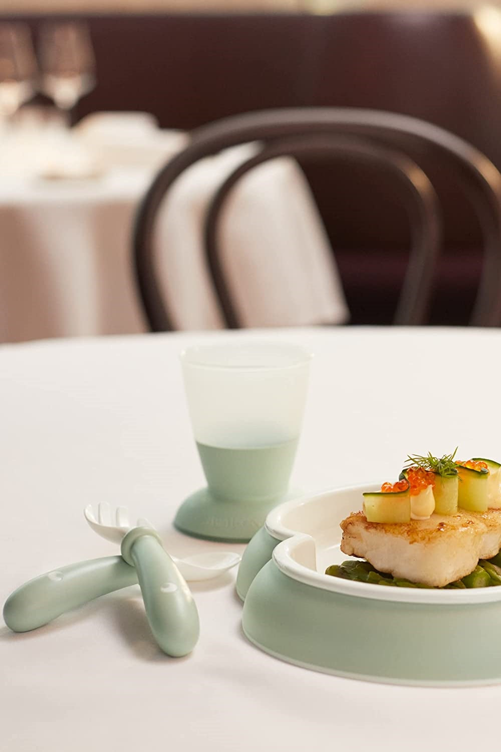 Our kitchen products have cleverly designed details that suit very young children. The plate’s trefoil shape makes scooping up food easier, while the strip underneath prevents the plate from sliding around. The spoon and fork are shaped to not slide down into the plate, and their short handles are easy to grip. The cup is stable, easy to hold, and its contents can be seen through the frosted plastic.