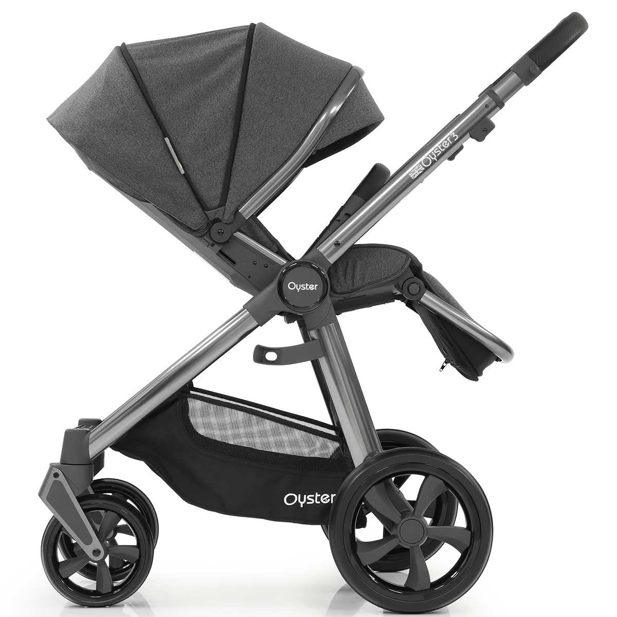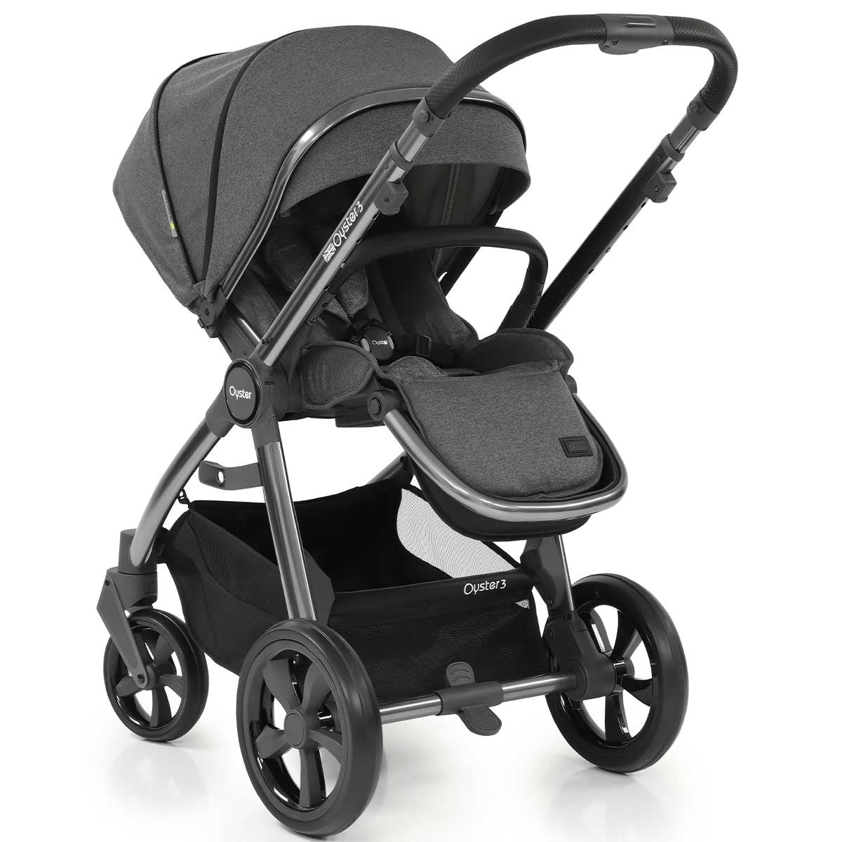Available in City Grey or Mirror, the chassis is intricately finished with a stitched handle and bumper bar. Oyster3 also features a large shopping basket, puncture-free tyres and all-round suspension for a smoother push.