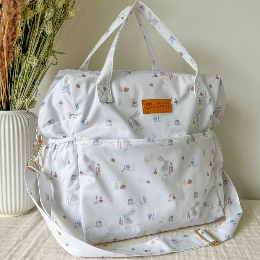 Large and spacious, it's got lots of room for clothing, nappies, snacks, toys etc. It makes a great overnight/sleepover and travel bag too!