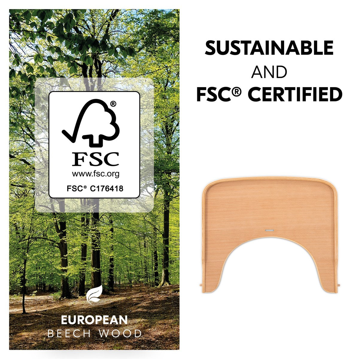 Introducing the Alpha Wooden Tray, a sustainable highchair tray designed for the hauck Alpha+ highchair. Crafted from European beech wood sourced from FSC® certified forests, this tray is perfect for children aged 6 to 36 months. Enhance your child's independence, safety, and comfort with this durable, easy-to-clean accessory.