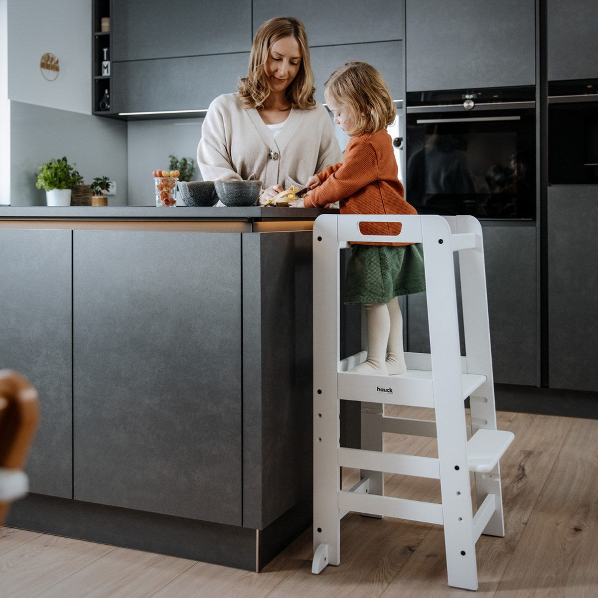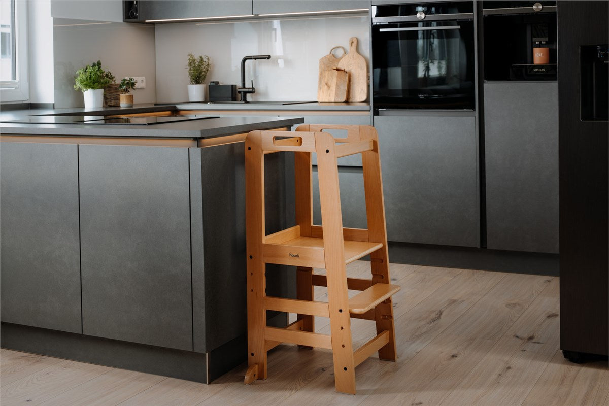 The Hauck Learn N Explore Learning Tower is crafted from sustainably sourced beechwood, combining durability with an eco-friendly approach. This thoughtfully designed learning tower allows young children to safely and easily reach areas that are typically above their height level. Whether assisting with meal preparation or learning to wash their hands, the tower encourages engagement in daily activities, fostering the development of manual skills and enhancing social skills, self-confidence, and independence. The tower's stable design supports up to 40 kg, making it a reliable choice for growing children. It features a three-position adjustable footplate, ensuring it grows with your child and remains useful for years.