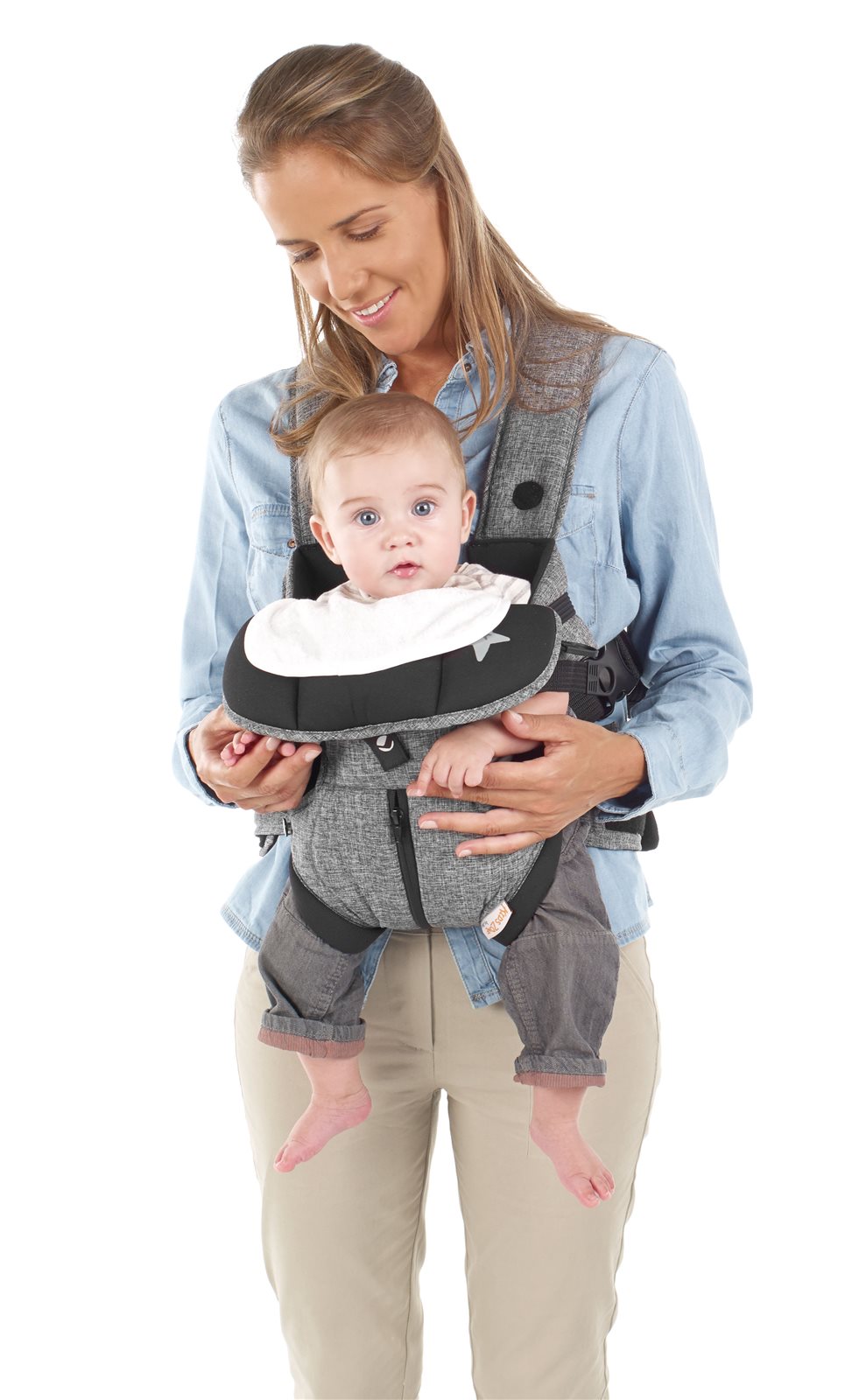 facing the carer, this helps the baby’s hips to develop as his legs are open wider helping to strengthen the baby's inner thigh muscles, as his knees are level with the carer’s hips
