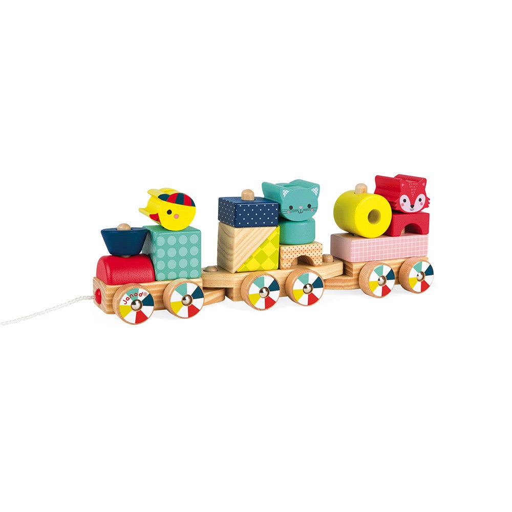 Boarding immediately, heading for the forest! The Baby Forest Train is a magnificent 2-in-1 wooden toy. It is first of all a fun train made up of 3 wagons and blocks of different sizes and colours to make and unmake endlessly, to develop your child's logic. It's also a toy to walk around with to encourage motor skills. From the age of one, your baby will be able to build this little multicoloured train with 3 pretty animal heads on it before taking it around the house. This beautiful early learning toy will become your baby's favourite walking companion. It will also allow him/her to imagine many stories with the duck, the cat and the fox! This toy consists of 14 colourful blocks with different geometric shapes and prints so that your little one can learn colours at his/her own pace and make his/her first constructions. When the vehicle starts to move, the wheels and their beautiful colours look great!