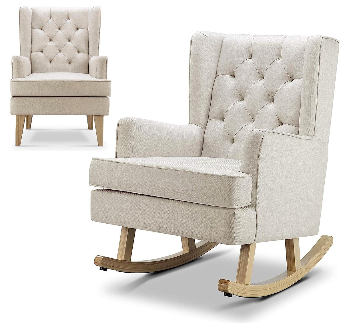 Configured with tapered hardwood legs, the chair seamlessly integrates into any contemporary living space. Its neutral fabric palette and chic tufted backrest bestow the Nested Soothe Easy Chair & Rocker with a modern, stylish look, making it a sophisticated addition to your nursery.
