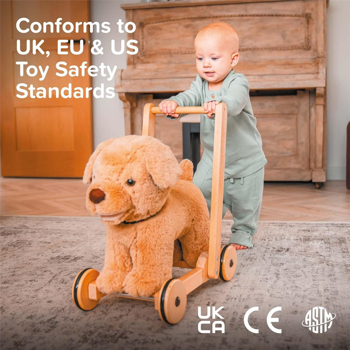 - Sturdy & Safe: Solid wooden frame with padded plush body and rubber tyres for grip and stability.