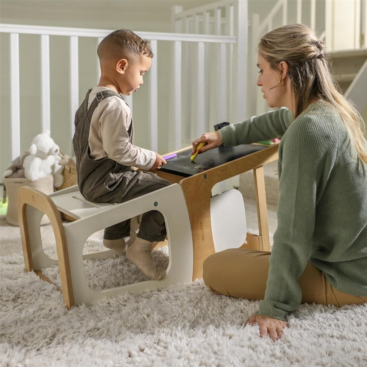 - Integrated Blackboard: Encourages creative play in table and chair mode.