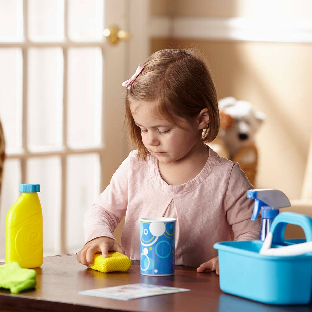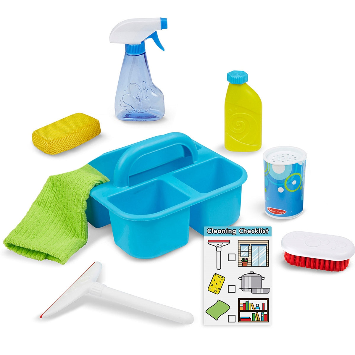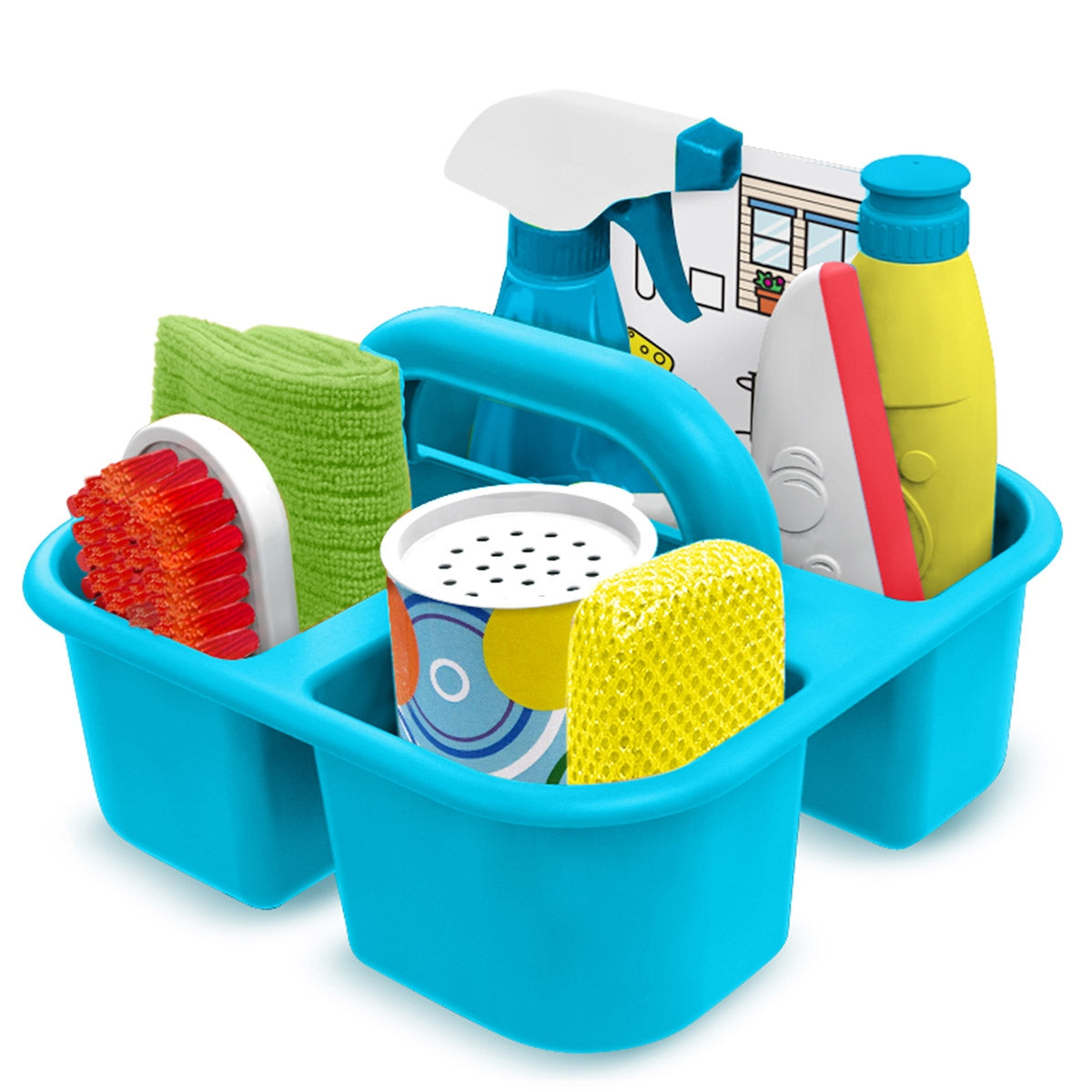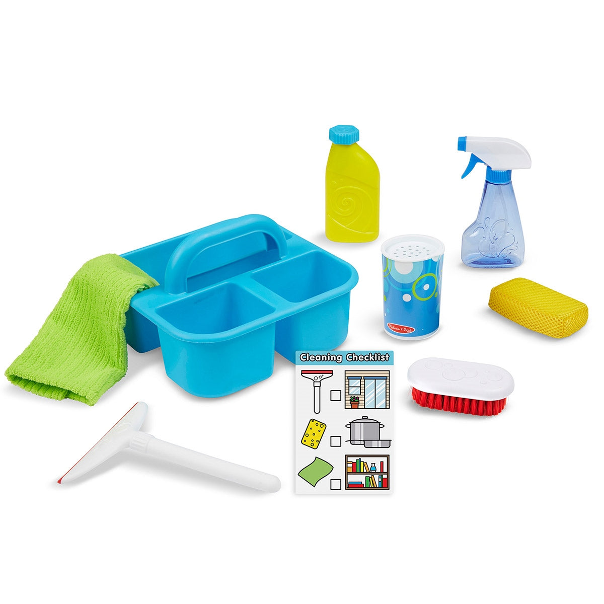 Part of playing house is keeping things sparkling clean! This pretend play cleaning set lets kids spray, squirt, squeegee, scour, and scrub using either real water or their imaginations. The spray bottle, scouring powder can, and soap bottle can be filled with water, making it perfect as a bath toy. The nine-piece set also includes supplies to keep things shining like a soft cloth, a scrub brush, a sponge, and a rubber-tipped squeegee! There's even a reusable checklist that helps kids learn what items work best to clean different household objects and areas. All of the supplies store neatly in the durable caddy with a built-in handle for easy toting. Promotes fine and gross motor skills and encourages imaginative play. Not for use with real cleaning materials.