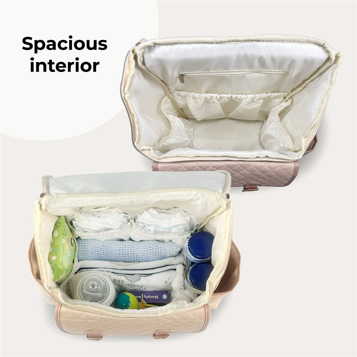 The stylish and practical Billie Faiers Blush backpack changing bag with rose gold detailing provides you with plenty of space to store all your baby's necessities when you're out and about, and coordinates with Blush Strollers from Billie's range. This backpack changing bag comes with a padded changing mat, insulated bottle holder, a large pocket at the front with 2 side pockets, perfect for all your bits and bobs. The adjustable and padded shoulder straps makes carrying this diaper bag easy and comfortable.
