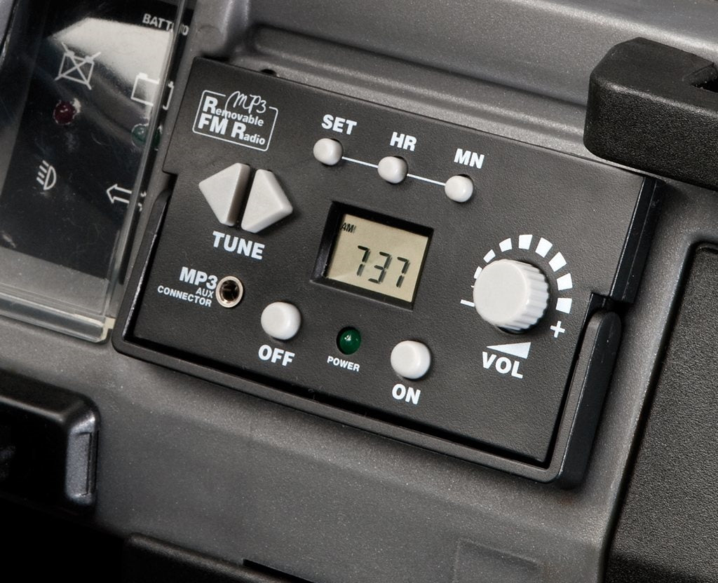 - FM radio with MP3 jack: The dash is equipped with a removable and portable FM radio. Audio jack for MP3 player (not included) and date/time display.