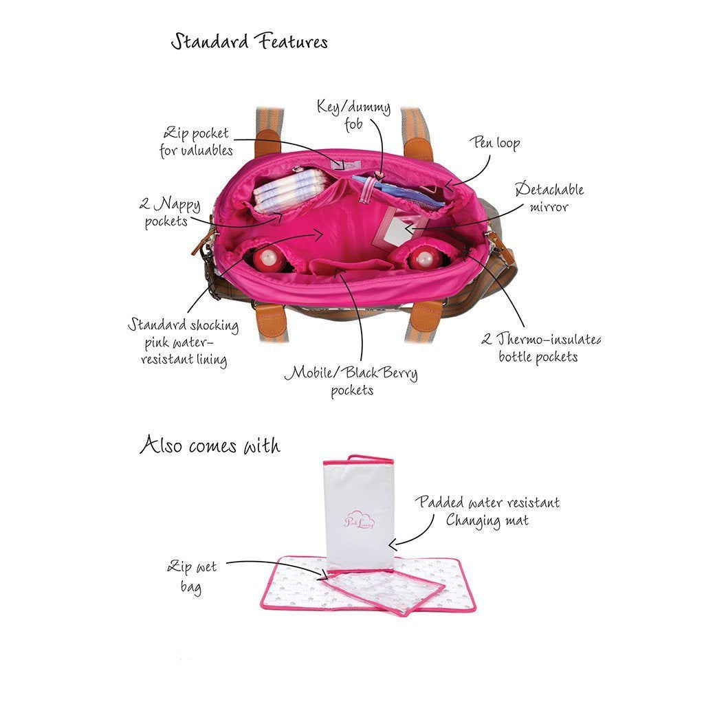 The Yummy Mummy changing bag is pretty, yet functional. A well designed interior is complemented on the outside with a pretty print and a vibrant embroidered appliqué of the signature cupcake design with the Yummy Mummy slogan on the front pocket, 2 additional side pockets are topped off with pretty bows. Handy tote handles ensure this designer bag is truly convenient to use every day.