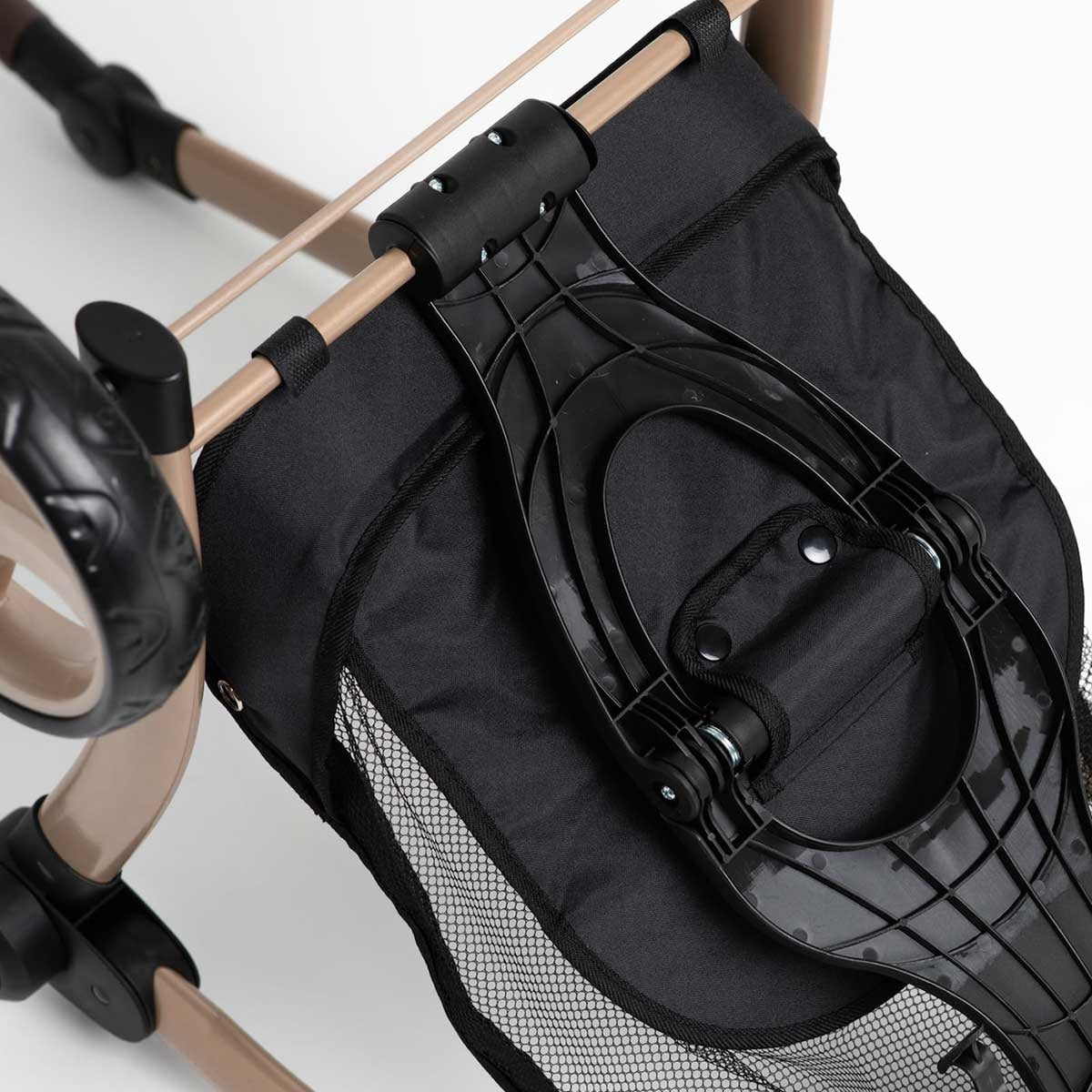 The egg® Dolls Pram also folds for storage. Simply remove the carrycot, then fold down the handle using the egg button on either side. Pull on the handle in the basket to collapse the frame.