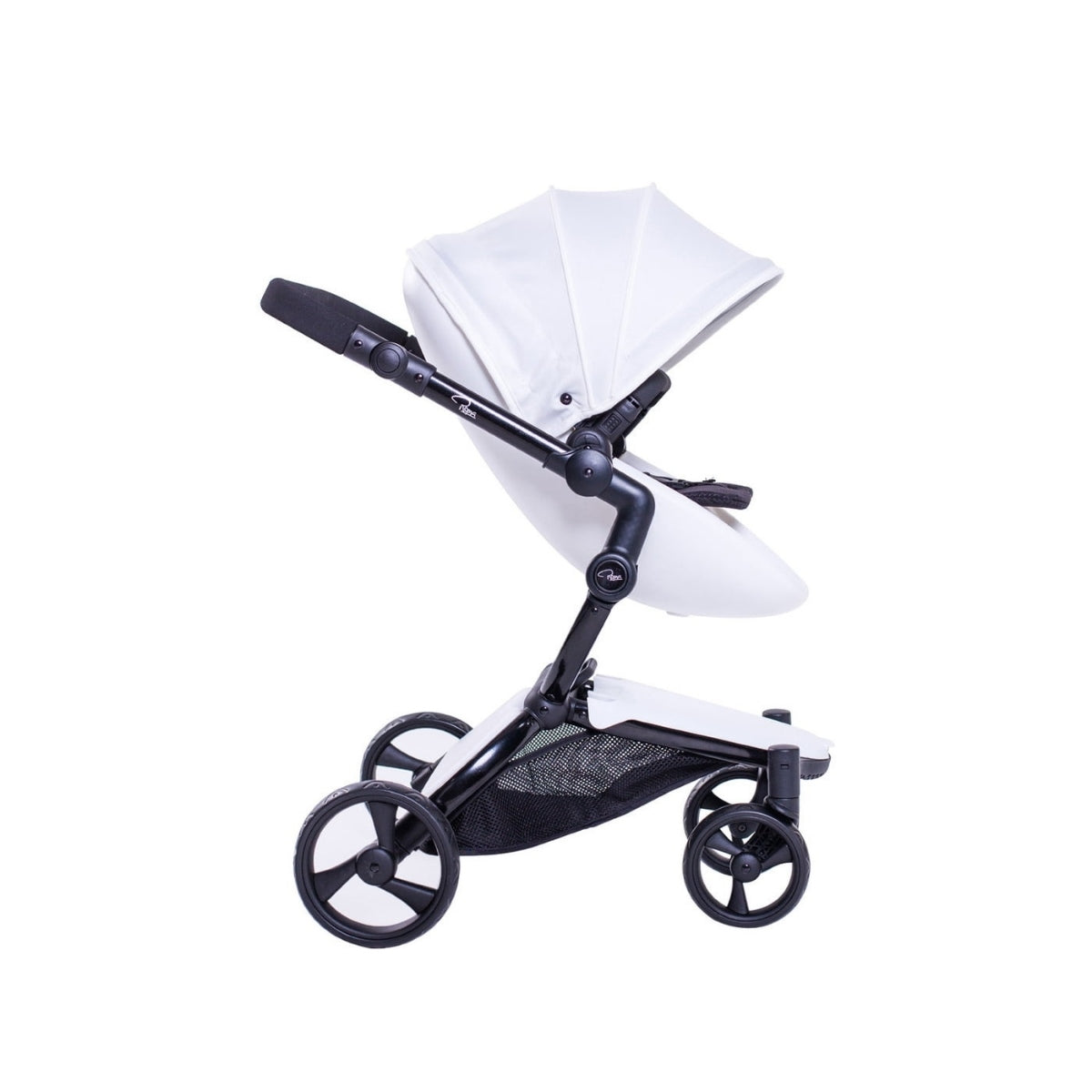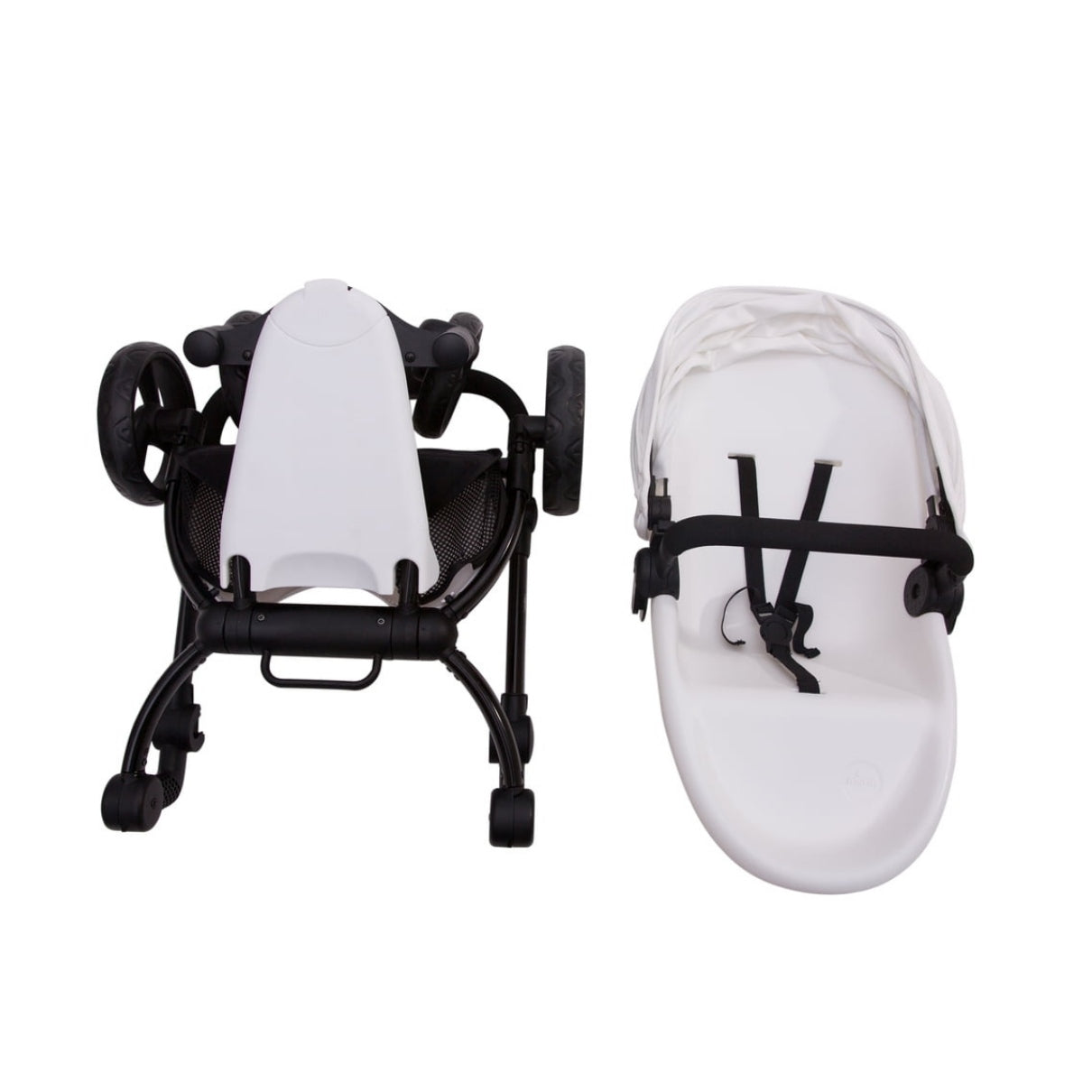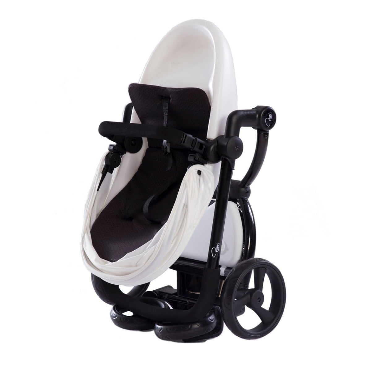 The Jemima dolls pram is a miniature version of Mum's pram! With a two-way facing seat unit, the Jemima mimics the features of a full size pram. The smooth black chassis looks stunning against the wipe-clean white fabrics.