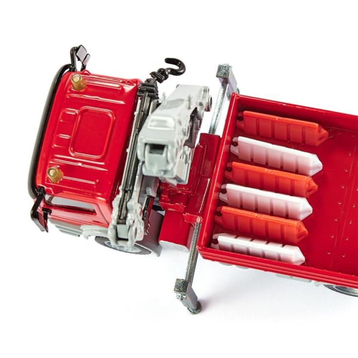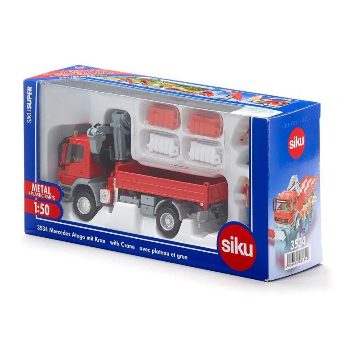 The Mercedes-Benz Atego with crane, to 1:50 scale, is an essential for any construction site. The loading crane was modelled on the original Palfinger series. Driver's cabin, chassis and body are mainly out of metal. Many details were lovingly finished. The crane is rotatable, with multi-folding system set to working position. With two extendable supports. Pallet for tipping. Accessories such as workmen and traffic cones complete this model.