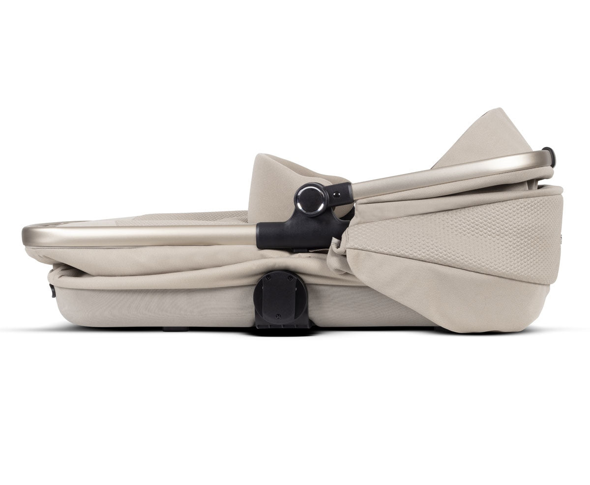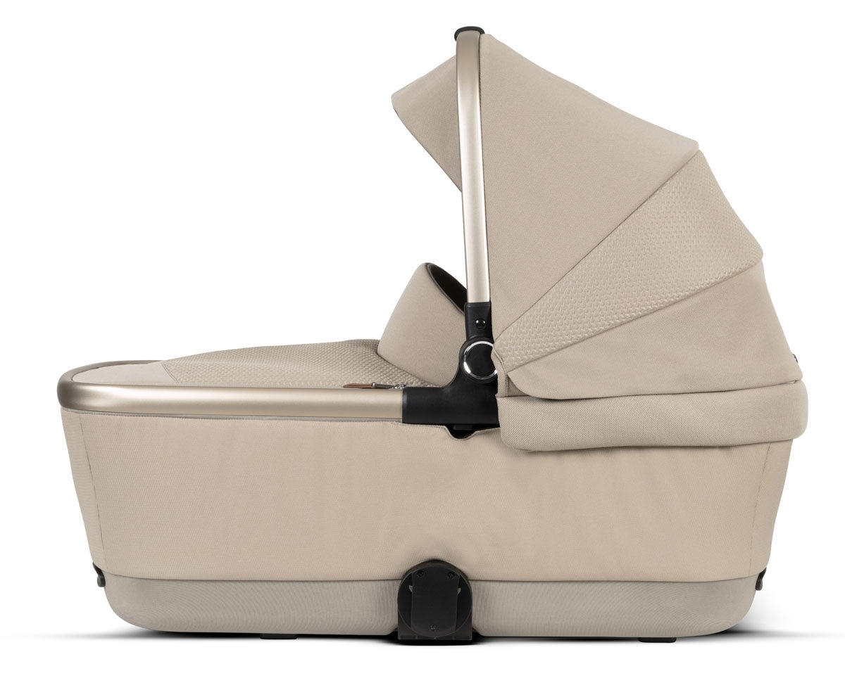 The new first-bed folding carrycot offers an ideal sleeping solution for new-borns. Featuring Bamboo fabrics, the full-ventilated carrycot ensures ultimate baby comfort with an intelligently designed hard-shell base inspired by compact suitcase technology. The carrycot can be lifted simply from the chassis with one hand. Folding completely flat, the innovative, patented design allows easy storage and transportation.