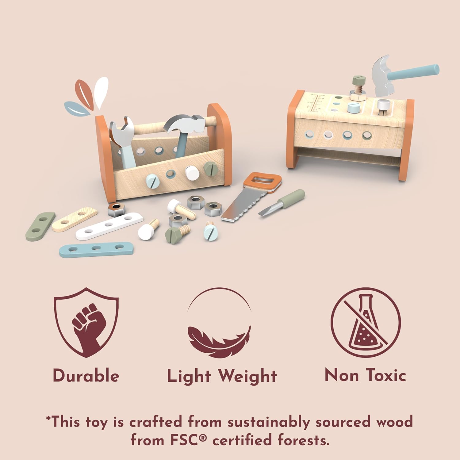Crafted from durable, certified wood, this multifunctional toy is built to last while providing endless opportunities for role play. The 2-in-1 design allows children to carry their tools neatly inside the toolbox, then transform it into a sturdy workbench for exciting building projects. With a hammer, saw, screwdriver, wrench, screws, and nails included, little builders can enjoy hours of interactive, educational play. The compact size makes it ideal for small spaces, travel, or as a thoughtful gift for curious children aged 3 and above.