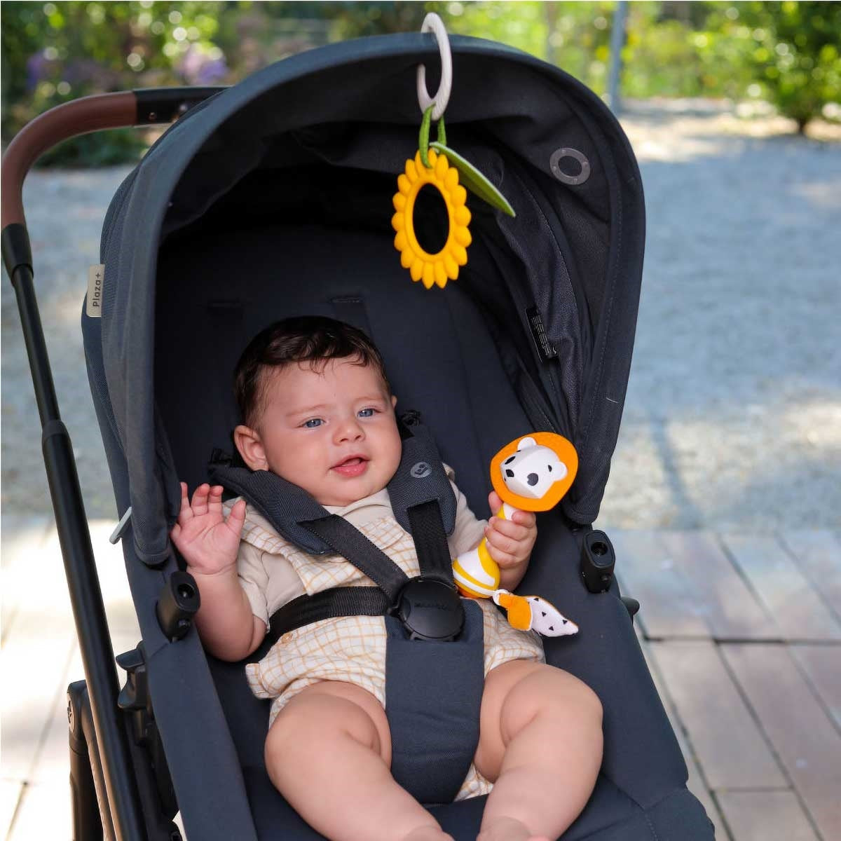- Compatible with prams, car seats, play gyms, and more, using the clip & go rings for easy attachment.