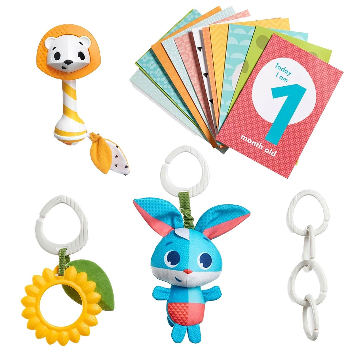 One of the unique features of this gift set is the inclusion of 12 monthly milestone cards. These cards provide valuable developmental insights and help parents document their baby's growth through adorable monthly photos. The high-contrast colours and playful designs ensure the toys not only keep your baby entertained but also aid in their sensory and emotional development.